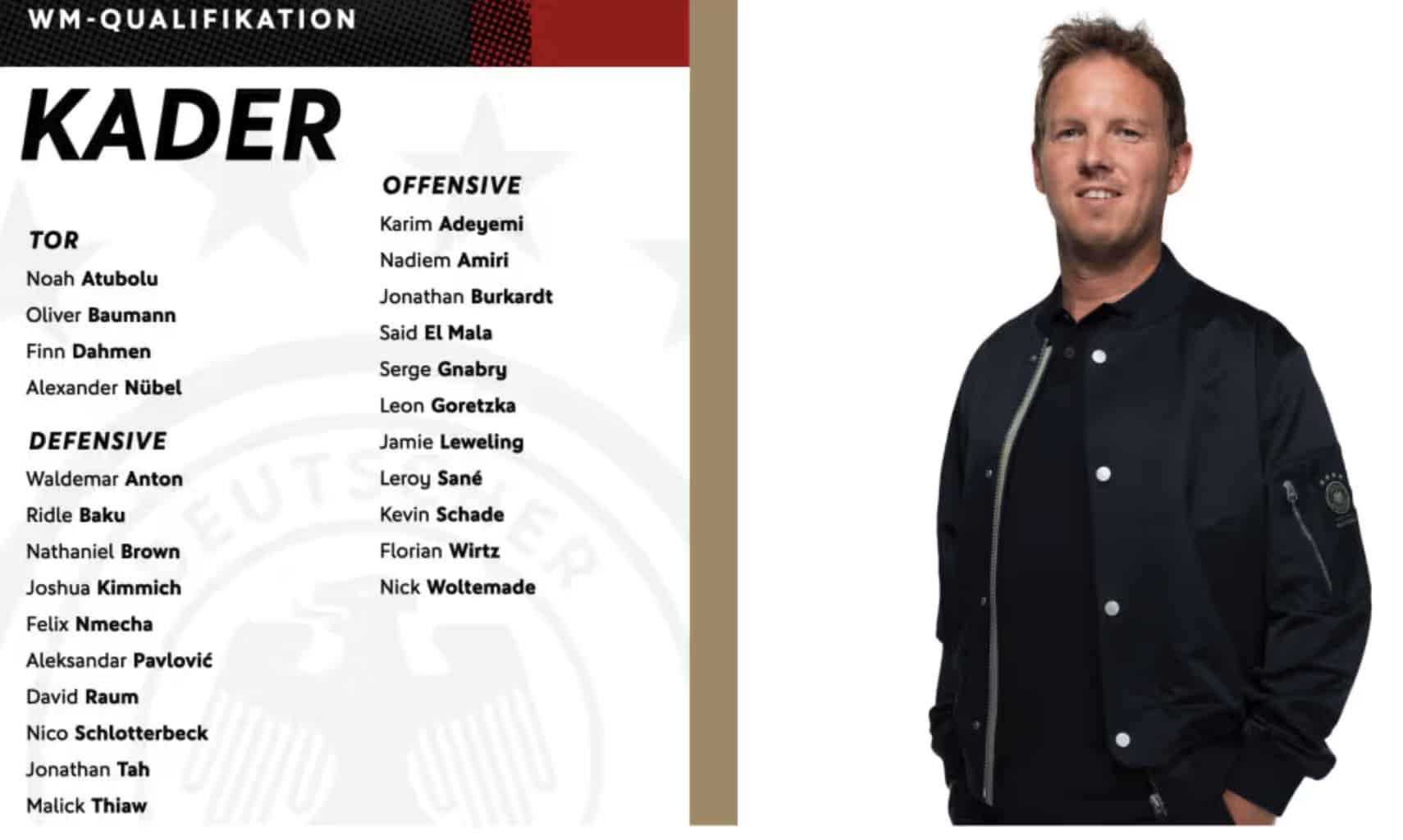 Nagelsmann bleibt vom Verletzungspech verfolgt. Mit Jamal Musiala, Antonio Rüdiger, Kai Havertz, Marc-André ter Stegen und weiteren Stammspielern fehlen zentrale Säulen. Auch Alternativen wie Henrichs oder Füllkrug stehen nicht zur Verfügung. Entsprechend bunt und flexibel fällt der 25-Mann-Kader aus – mit neuen Gesichtern wie Alexander Nübel, Jamie Leweling oder Kevin Schade.