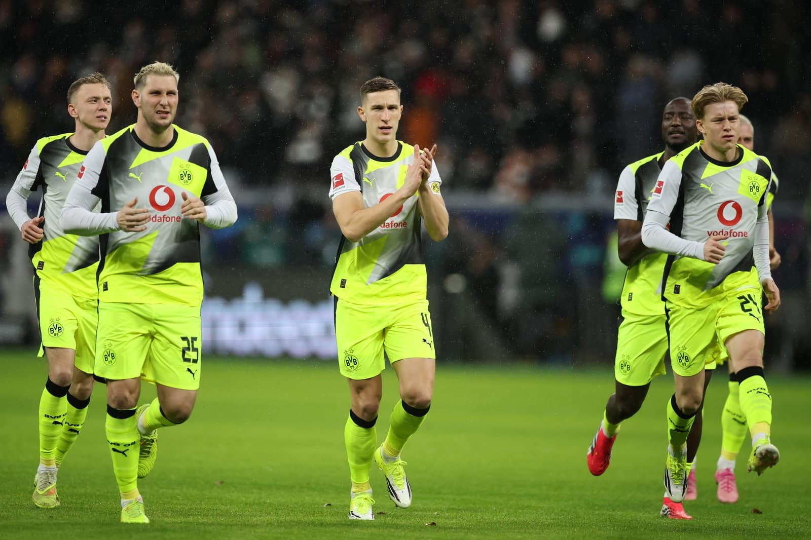 Nico Schlotterbeck und Teamkollegen von Borussia Dortmund bedanken sich vor dem Bundesliga-Spiel bei Eintracht Frankfurt im Deutsche Bank Park am 9. Januar 2026 bei den mitgereisten Fans. Alex Grimm / Getty Images