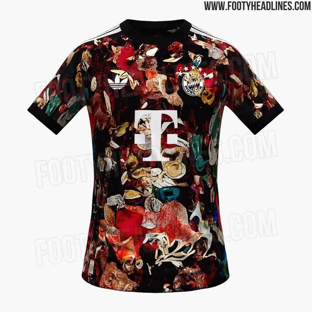 Das eigentliche Highlight der Bayern-Kollektion 2026/27 ist das vierte Trikot, das es so noch nie gegeben hat. Das Design zeichnet sich durch einen schwarzen Grundton mit einem mehrfarbigen Allover-Muster aus, wodurch eine auffällige und markante Ästhetik entsteht, die sich deutlich von den typischen Trikotdesigns des FC Bayern unterscheidet.