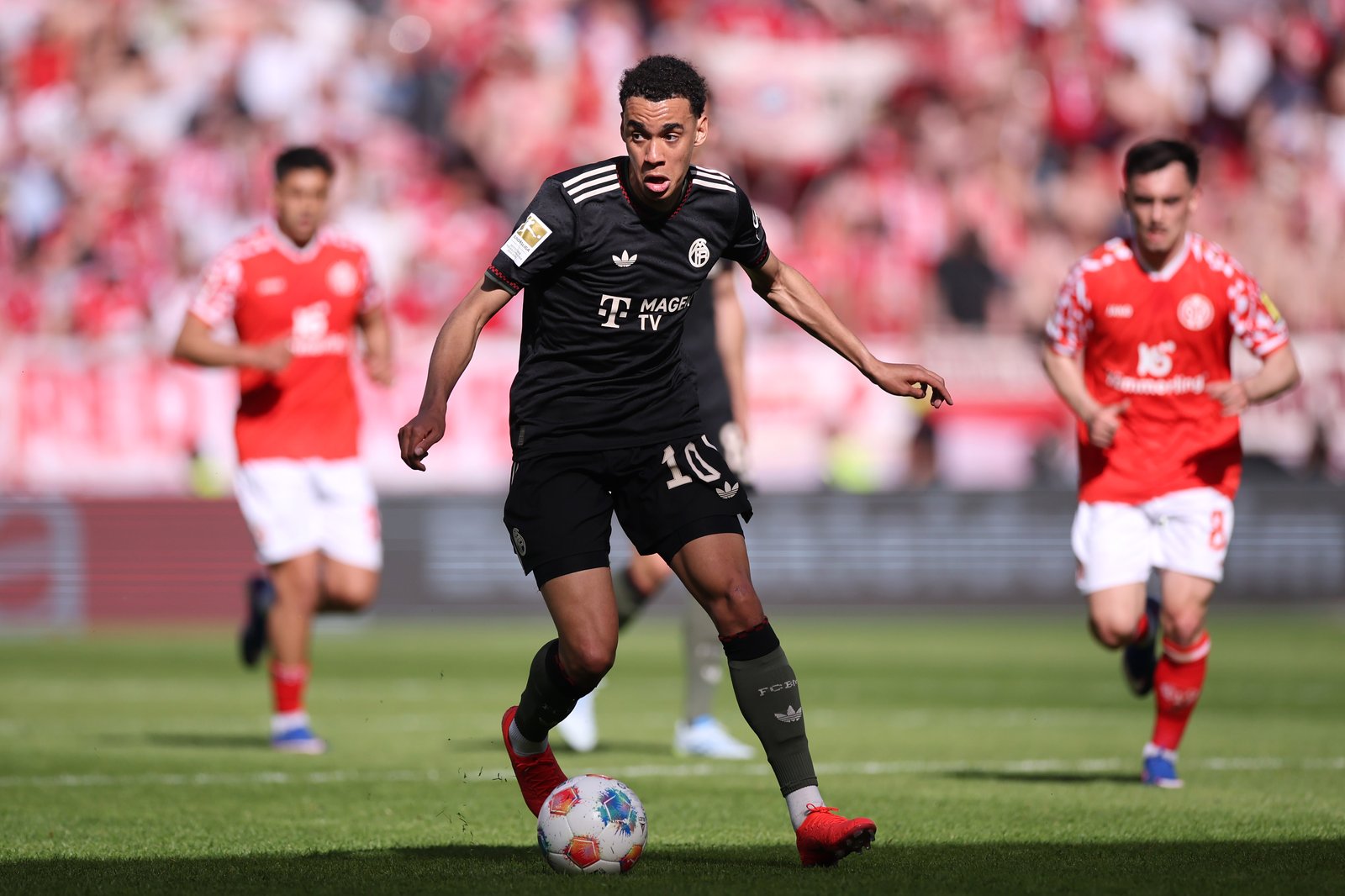 Jamal Musiala vom FC Bayern München am Ball beim Bundesliga-Auswärtsspiel bei Mainz 05 in der MEWA Arena am 25. April 2026. Der Mittelfeldspieler der Münchner treibt den Ball nach vorne, im Hintergrund setzen Mainzer Spieler nach. (Alex Grimm / Getty Images)