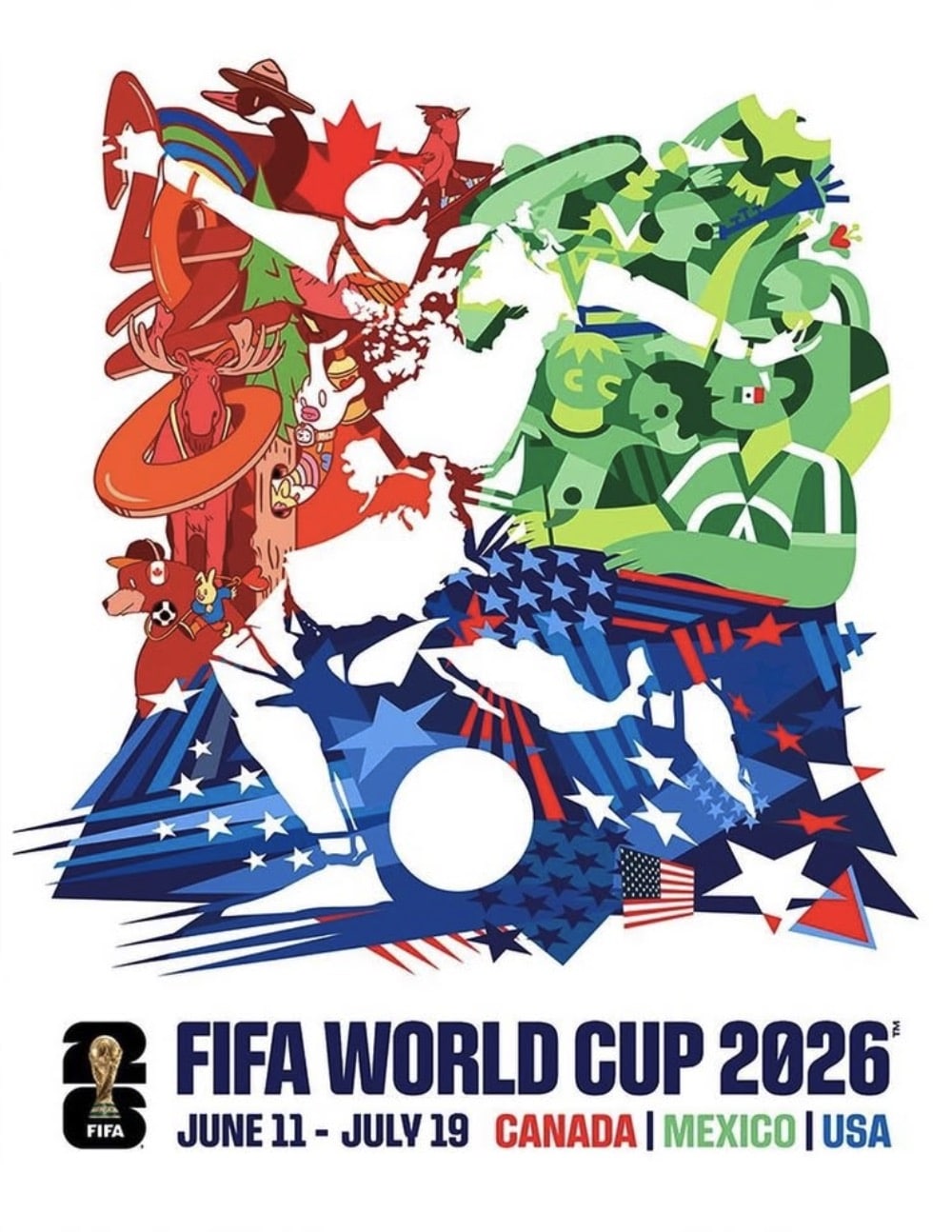 Erstmals in der Geschichte einer Fußball‑WM gestalteten drei Künstler gemeinsam das offizielle Turnierposter: der Kanadier Carson Ting, die Mexikanerin Minerva GM und der US‑Amerikaner Hank Willis Thomas. Die Zusammenarbeit kombiniert unterschiedliche künstlerische Stile und soll die Verbindung zwischen den Gastgeberländern Kanada, Mexiko und den USA betonen. FIFA hob hervor, dass diese Gemeinschaftsarbeit die Verbindung und Zusammengehörigkeit über nationale Grenzen hinweg unterstreicht.