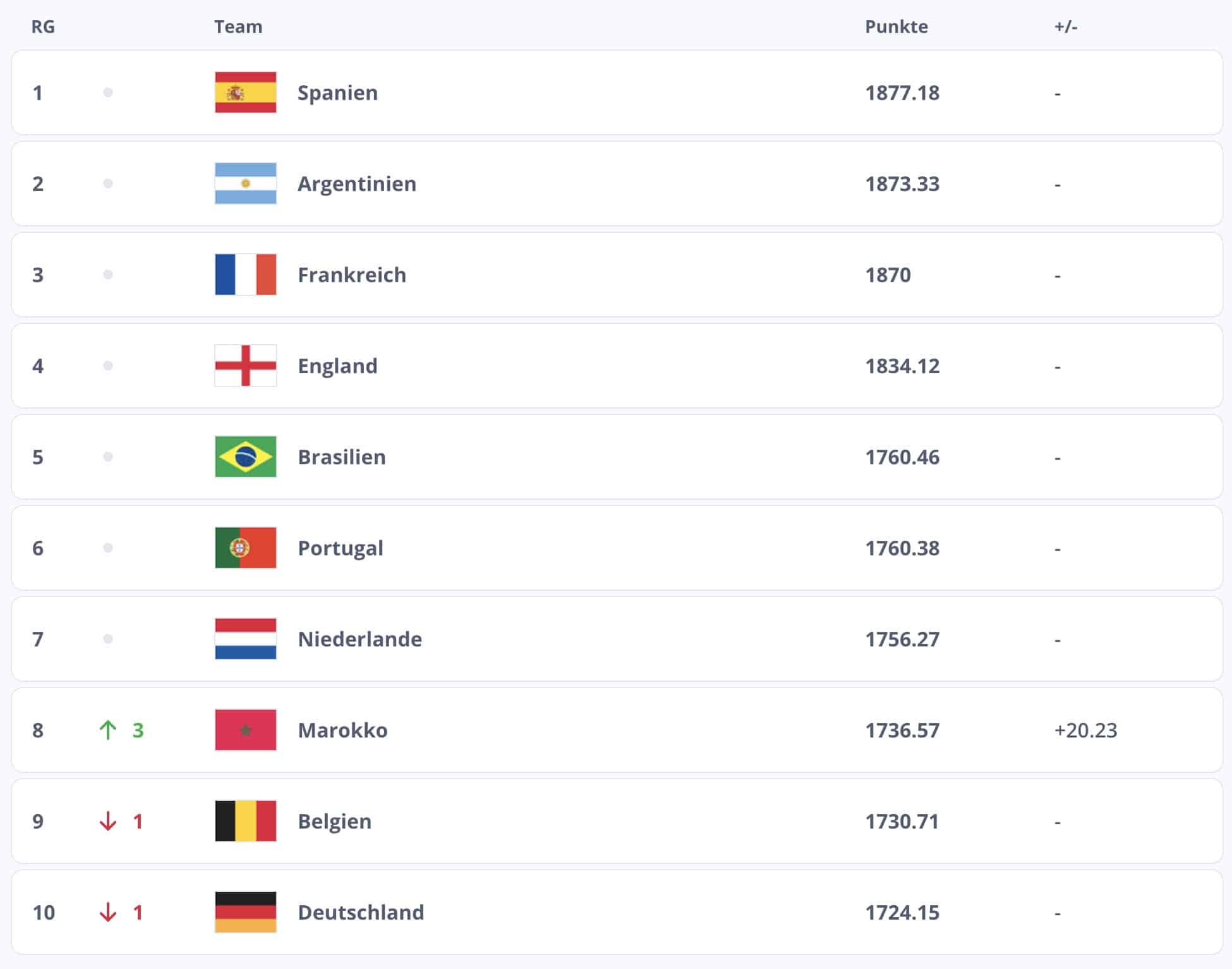 Die deutsche Nationalmannschaft hat mit 1724 Punkten den Rückstand auf die führenden Nationen, wie Spanien (1877 Punkte), Argentinien (1873 Punkte) und Frankreich (1870 Punkte), deutlich vor Augen. Diese Ranglistensituation stellt eine Herausforderung dar und zeigt, dass das DFB-Team noch einiges tun muss, um international wieder konkurrenzfähig zu sein.