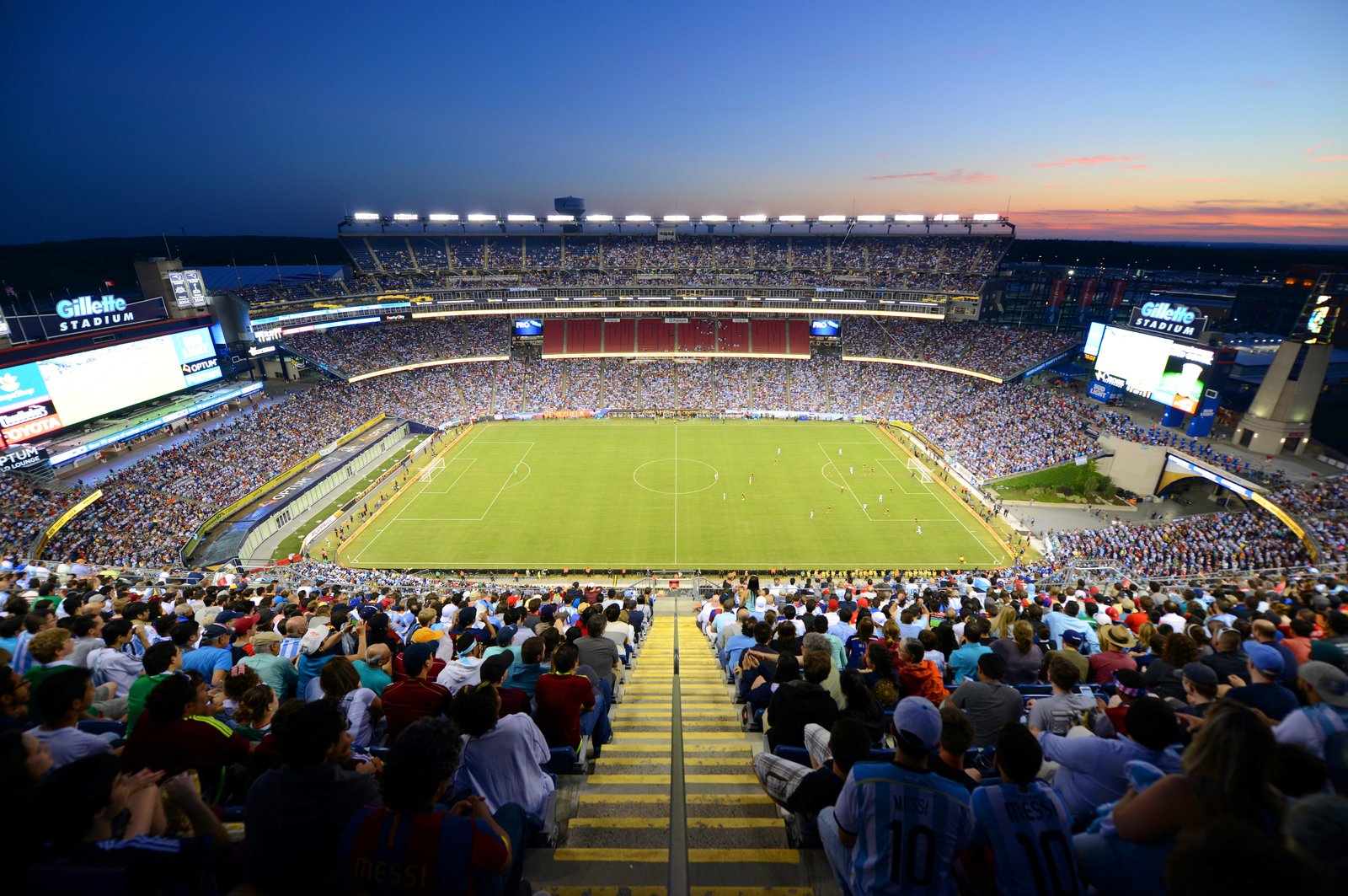 Das vollbesetzte Gillette Stadium in Foxborough bei Boston von innen während eines Fußballspiels im Abenddunkel – die Arena zählt zu den WM-2026-Spielorten in den USA und bietet mit ihrer stimmungsvollen Abendatmosphäre eine beeindruckende Kulisse für das Weltturnier. (Copyright Depositphotos.com)