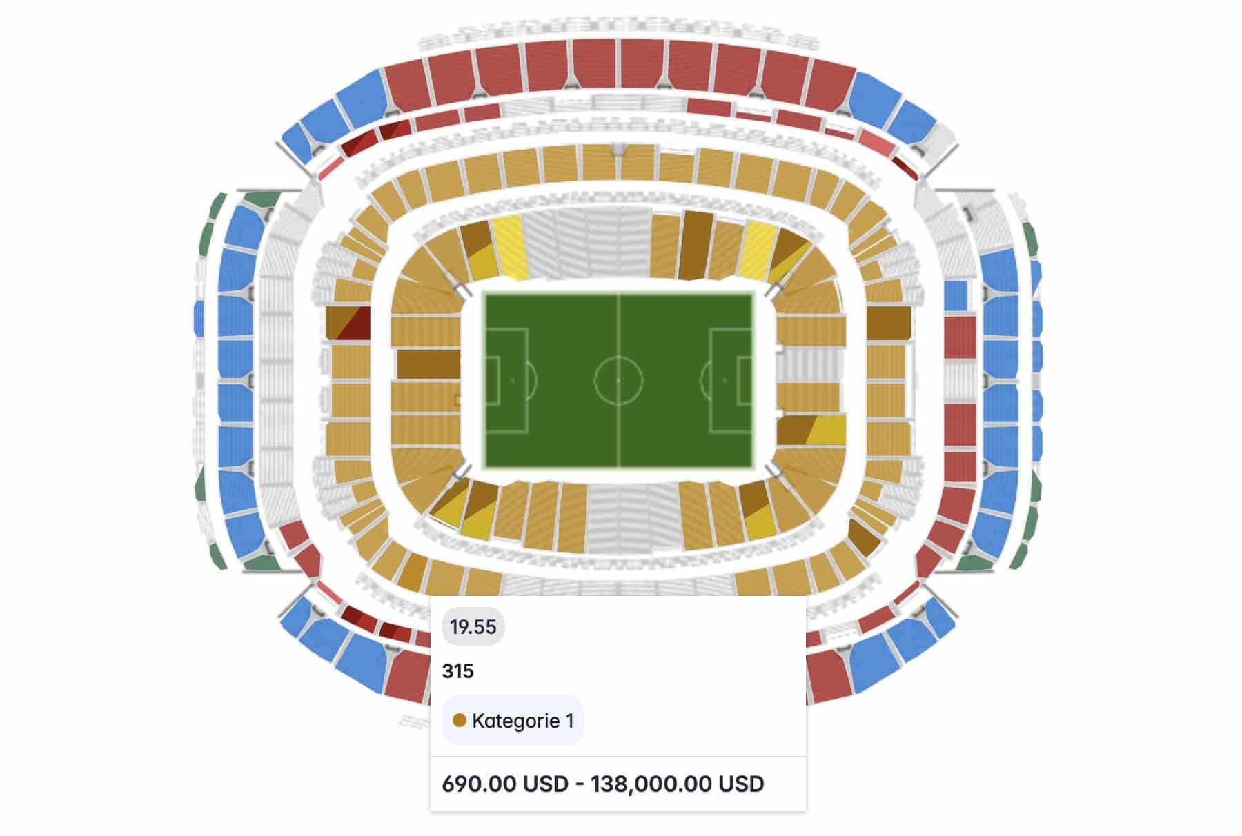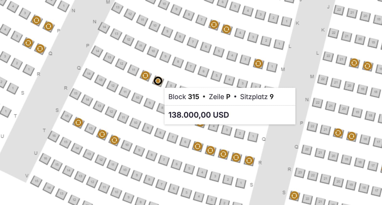 Die Plätze liegen in der viertletzten Reihe eines Blocks im Unterrang, seitlich versetzt hinter dem Tor. Ursprünglich kostete jedes dieser Tickets 8.860 Dollar, umgerechnet rund 7.582 Euro.