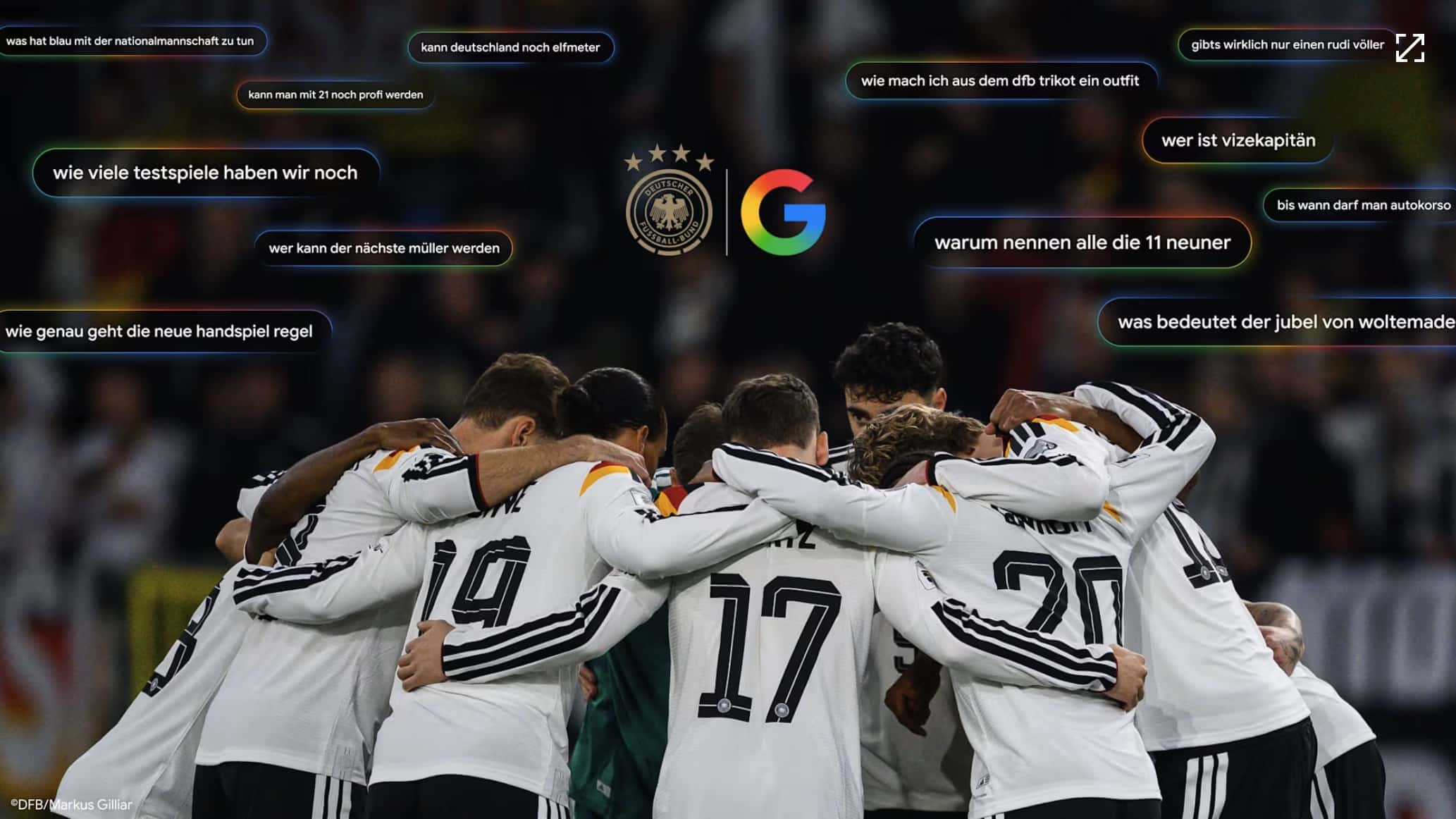 Google weitet seine Partnerschaft mit dem DFB aus und wird ab sofort auch Unterstützer der Männer-Nationalmannschaft. Vor allem im WM-Sommer soll die Suche den Fans bei Fragen rund um die DFB-Elf schnelle Hilfe liefern, von Spielständen über Aufstellungen bis zu Videohighlights. Auch der KI-Modus der Google-Suche soll komplexere, analytische Fragen beantworten.