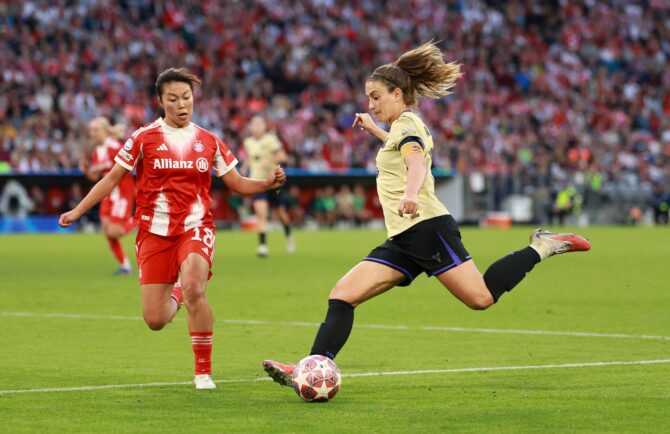 Rund sechs Monate nach der 1:7-Demütigung in der Ligaphase wollten die frisch gekürten Meisterinnen vor eigenem Publikum vor allem eines vermeiden, nämlich erneut unterzugehen. Der Auftakt war jedoch alles andere als ideal. Schon in der 8. Minute brachte Ewa Pajor, früher in Wolfsburg aktiv, den sechsmal in Serie möglichen Finalisten FC Barcelona in Führung. Nach einem Stellungsfehler von Giulia Gwinn stand die Angreiferin im Zentrum goldrichtig.