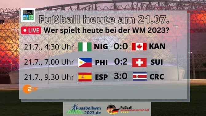 Am heutigen Freitag – den 21. Juni 2023 – finden 3 Vorrundenspiele der Frauenfußball WM 2023 Australien und Neuseeland statt. Den Auftakt am 2. Tag der WM macht Turnierfavorit Kanada gegen Nigeria um 4:30 Uhr. Weiterhin trifft um 7:30 Uhr der WM-Debütant Philippinen auf die Schweiz mit der deutschen Trainerin Inka Grings. Das 3. Spiel des Tages ist um 9:30 Uhr, wo Spanien und Costa Rica aufeinandertreffen. Die Live-Übertragung im TV übernimmt heute das ZDF – das frühe Spiel läuft hingegen ausschließlich im Internet-Livestream auf ZDF Sport.de.