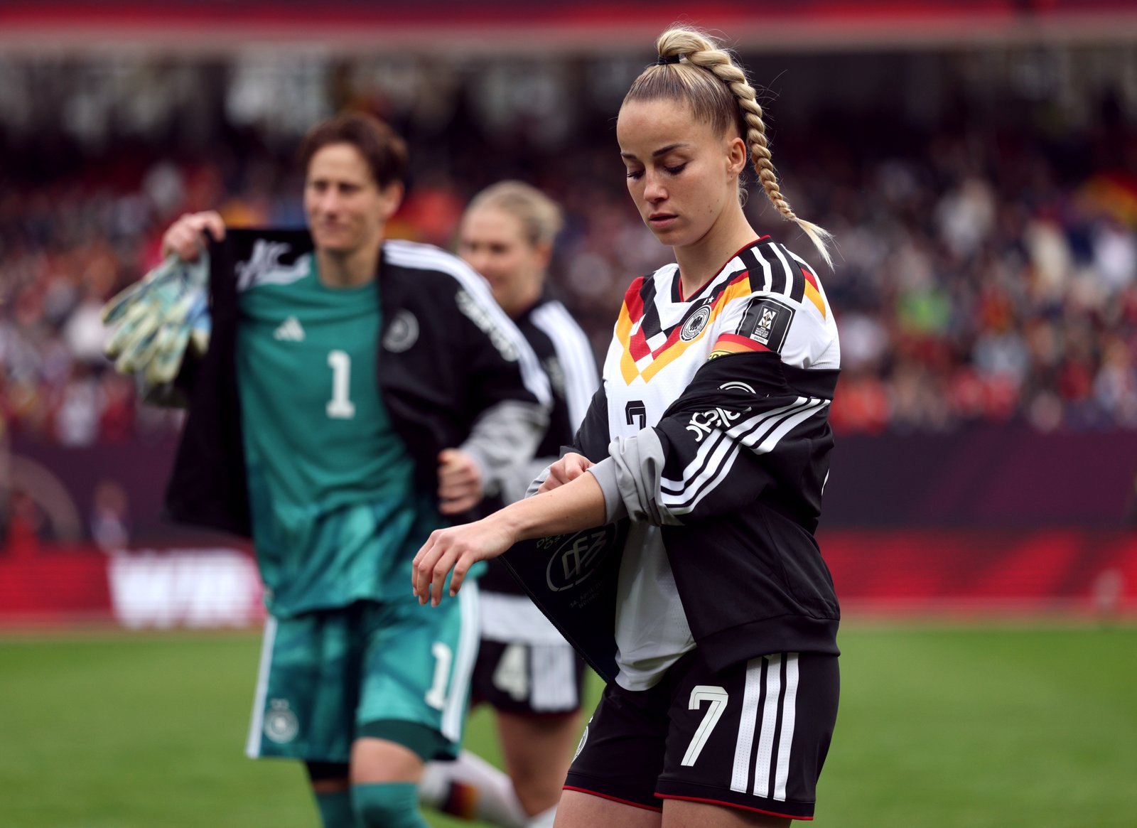 Giulia Gwinn (Nr. 7) verlässt sichtlich betroffen den Platz, nachdem sie beim WM-Qualifikationsspiel zwischen Deutschland und Österreich verletzungsbedingt ausgewechselt wurde. Die Aufnahme vom 14. April 2026 im Max-Morlock-Stadion in Nürnberg zeigt die Spielerin vor der deutschen Auswechselbank. Adam Pretty / Getty Images