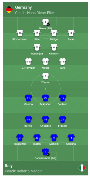 Die deutsche Startelf: 1 Manuel Neuer (C) – 2 Antonio Rüdiger, 3 David Raum, 6 Joshua Kimmich, 9 Timo Werner, 13 Thomas Müller, 15 Niklas Süle, 16 Lukas Klostermann, 18 Jonas Hofmann, 19 Leroy Sané, 21 Ilkay Gündogan.