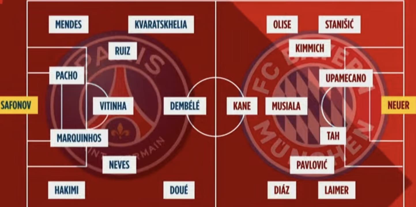 Safonov, Hakimi, Marquinhos, Pacho, Nuno Mendes, Joao Neves, Vitinha, Fabian, D. Doué, Dembelé, Kvaratskhelia.