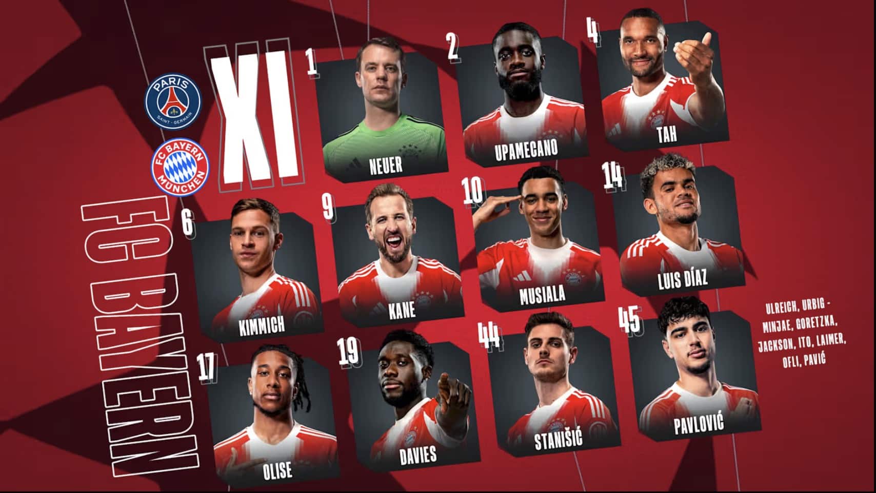 Neuer – Upamecano, Tah, Kimmich, Kane, Musiala, Luis Díaz, Olise, Davies, Stanišić, Pavlović.