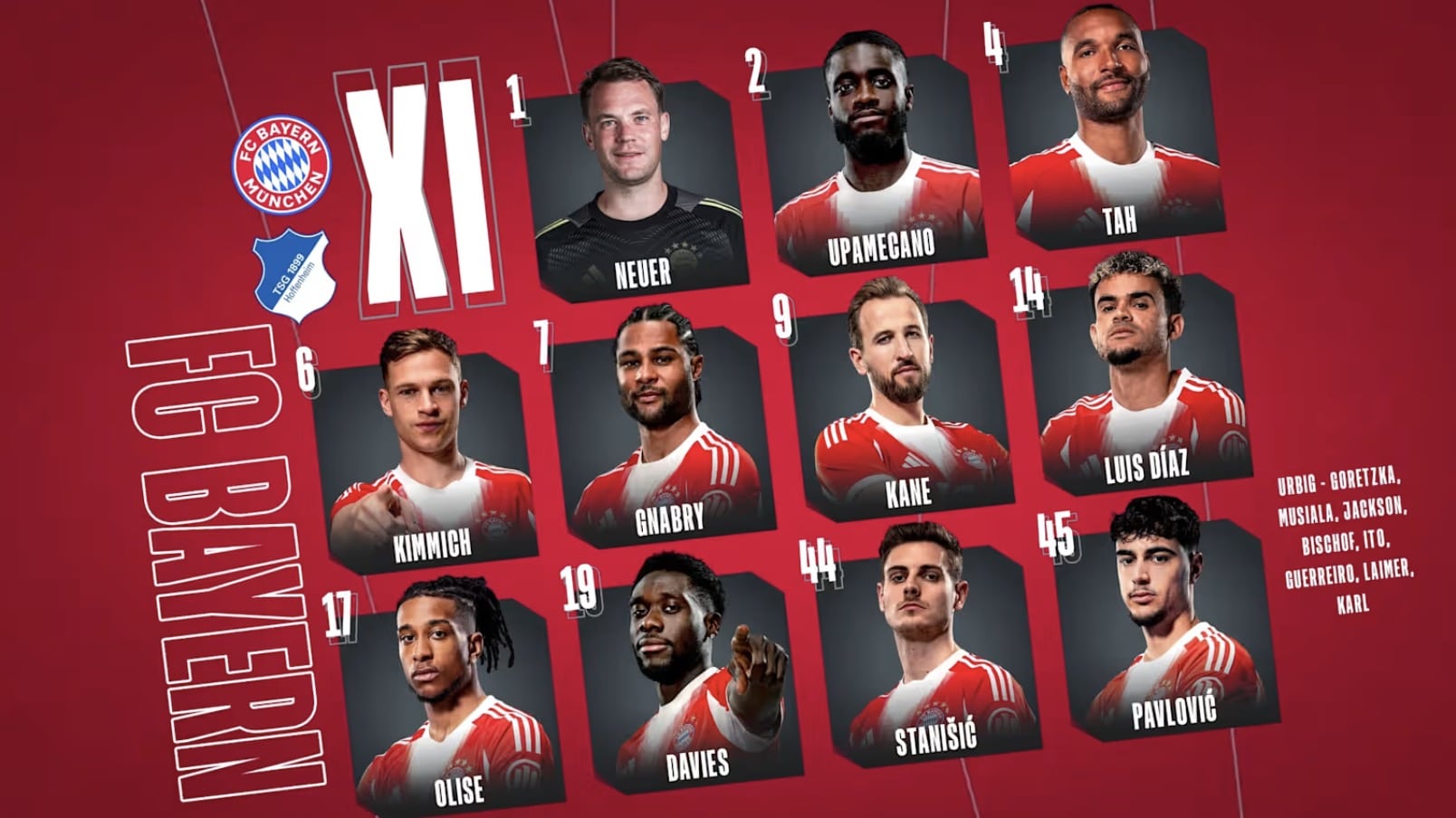 Neuer – Upamecano, Tah, Kimmich, Gnabry, Kane, Luis Díaz, Olise, Davies, Stanišić, Pavlović.