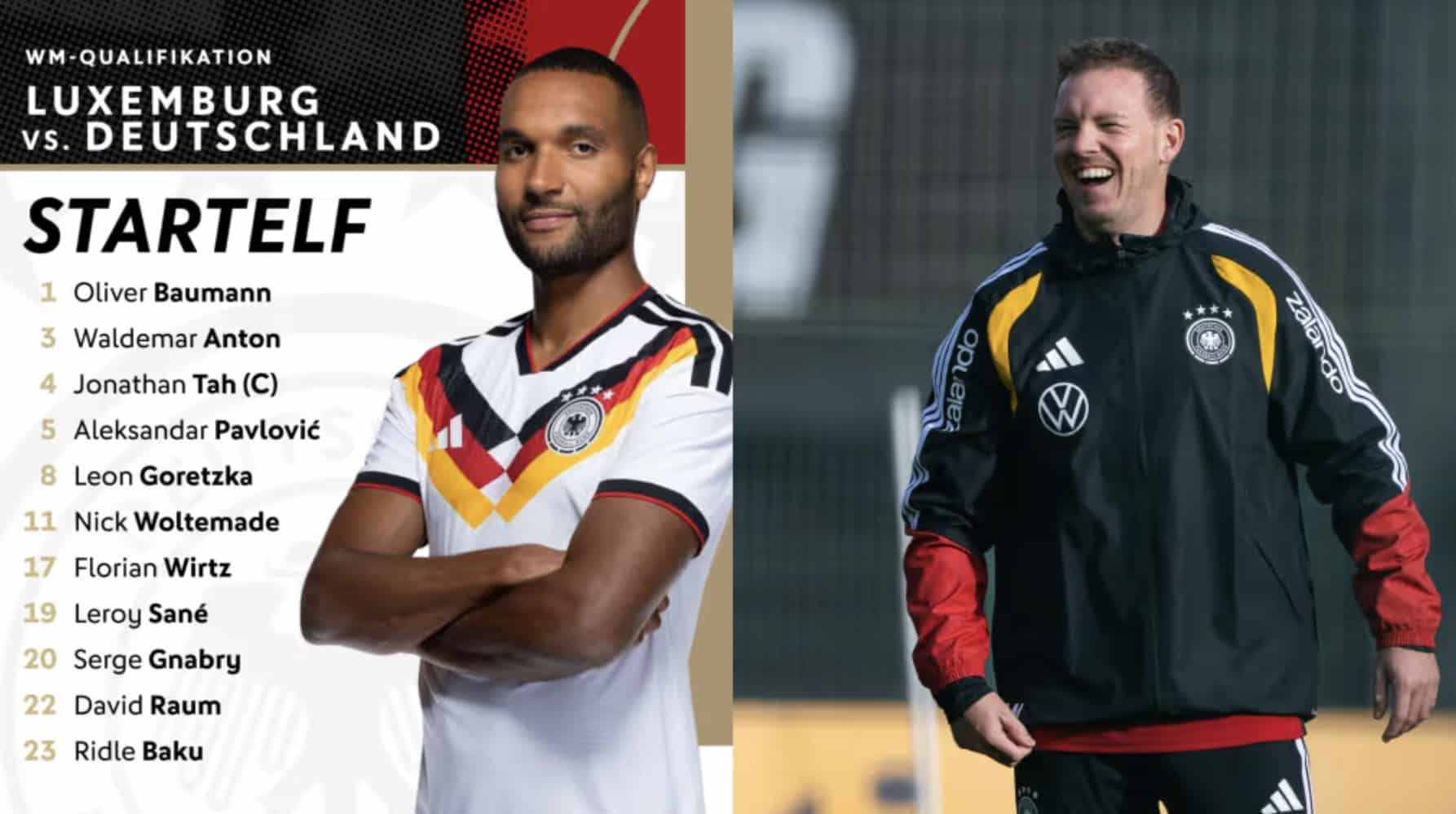 1 Baumann – 23 Baku, 4 Tah, 3 Anton, 22 Raum – 8 Goretzka, 5 Pavlovic – 19 Sané, 20 Gnabry, 17 Wirtz – 11 Woltemade