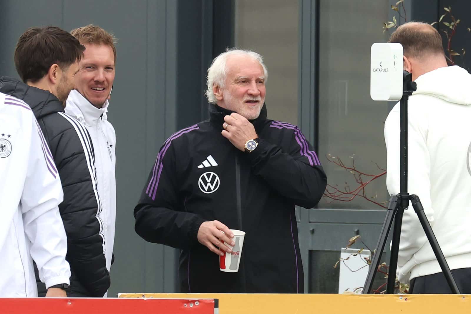 Bundestrainer Julian Nagelsmann spricht beim Training der deutschen Nationalmannschaft am 12. Oktober 2025 auf dem adidas Homeground in Herzogenaurach mit Sportdirektor Rudi Völler. Foto: Alexander Hassenstein / Getty Images Europe