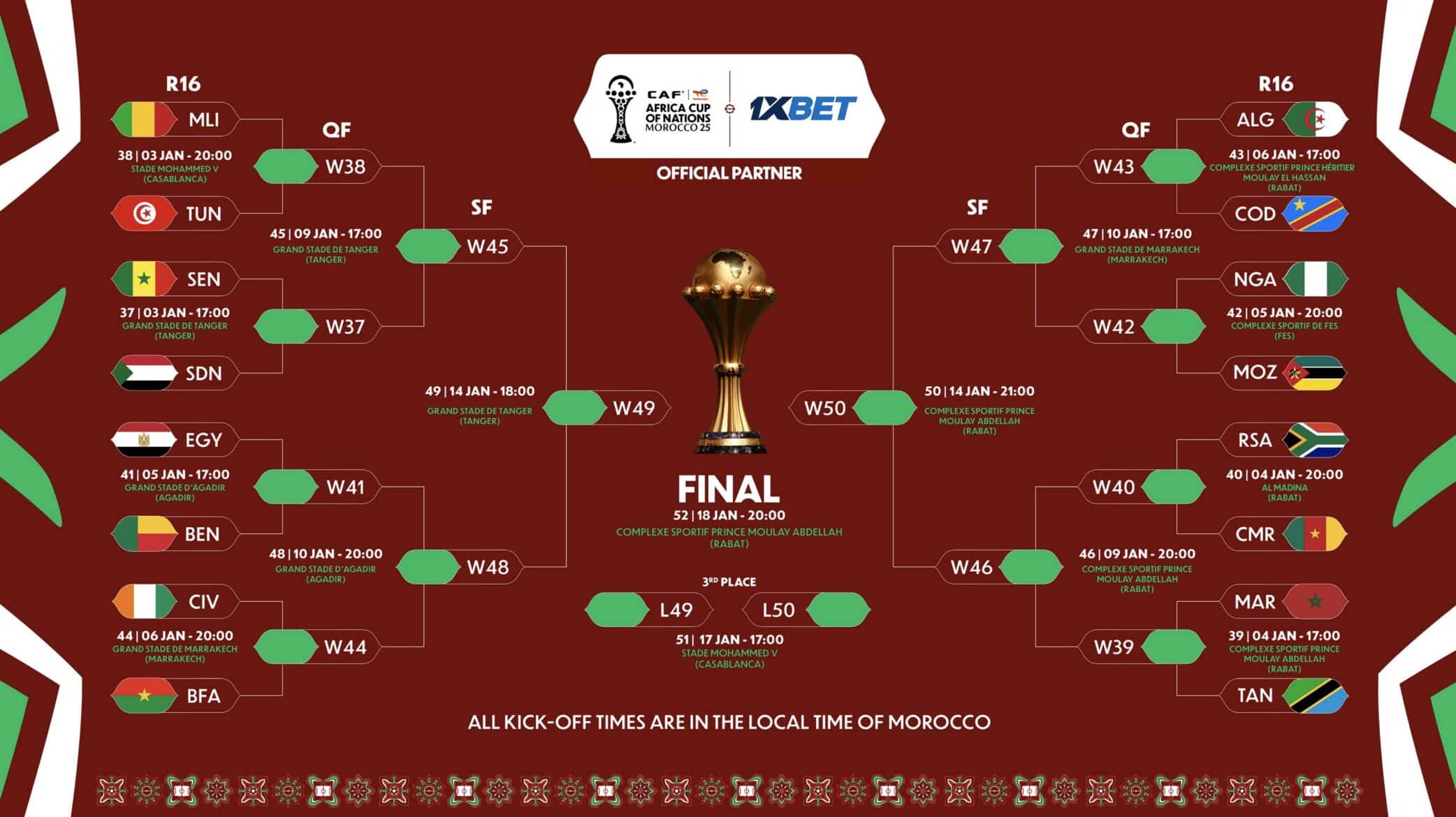 Die erste K.o.-Runde des Turniers findet vom 3. bis 6. Januar statt, mit täglich zwei Spielen um 17:00 Uhr Ortszeit und 20:00 Uhr Ortszeit. Die 16 verbleibenden Mannschaften kämpfen um den Einzug ins Viertelfinale. Der Gastgeber Marokko trifft am Sonntag auf Tanzania im Stade Prince Moulay Abdellah in Rabat. Die marokkanische Nationalmannschaft, die die Gruppe A anführte, strebt ihren ersten kontinentalen Titel seit 50 Jahren an.