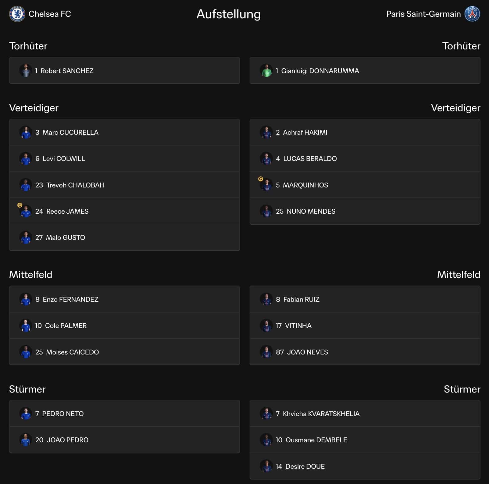 Im Tor ist Sanchez gesetzt. In der Innenverteidigung dürfte Colwill nach seiner Sperre zurückkehren und Chalobah ergänzen. Außen verteidigen Gusto und Cucurella. Im defensiven Mittelfeld bahnt sich ein Zweikampf zwischen Santos und Caicedo an – mit leichten Vorteilen für Santos. Offensiv sind Palmer, Fernandez, Nkunku und Neto wohl gesetzt. Die spannendste Personalie betrifft die Neun: Joao Pedro oder Delap? Nach zwei Toren im Halbfinale spricht vieles für Pedro.