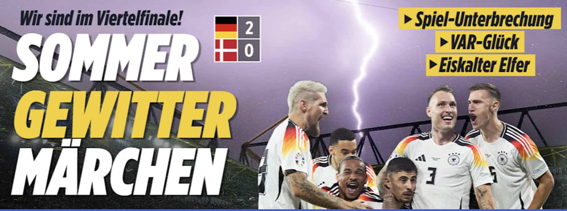 Kurier: „Achtelfinal-Triumph gegen Dänemark: Deutsche EM-Party nach Donnerwetter. Zwischen kollektiver Ernüchterung und totaler Euphorie lagen gerade einmal 90 Sekunden. Eineinhalb Minuten, in denen die Fußballfans der EM-Gastgeber schlagartig aus dem Tal der Tränen auf Wolke sieben katapultiert wurden.“