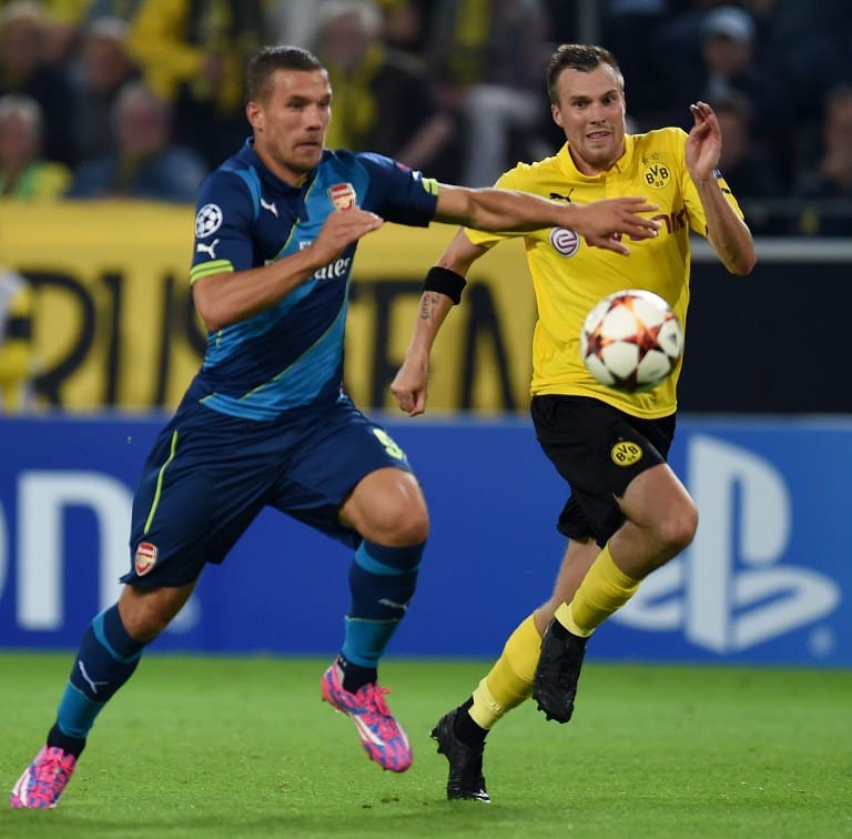 Foto AFP: Lukas Podolski (damals noch bei Arsenal London) in der Champions League gegen den BVB und Kevin Großkreutz