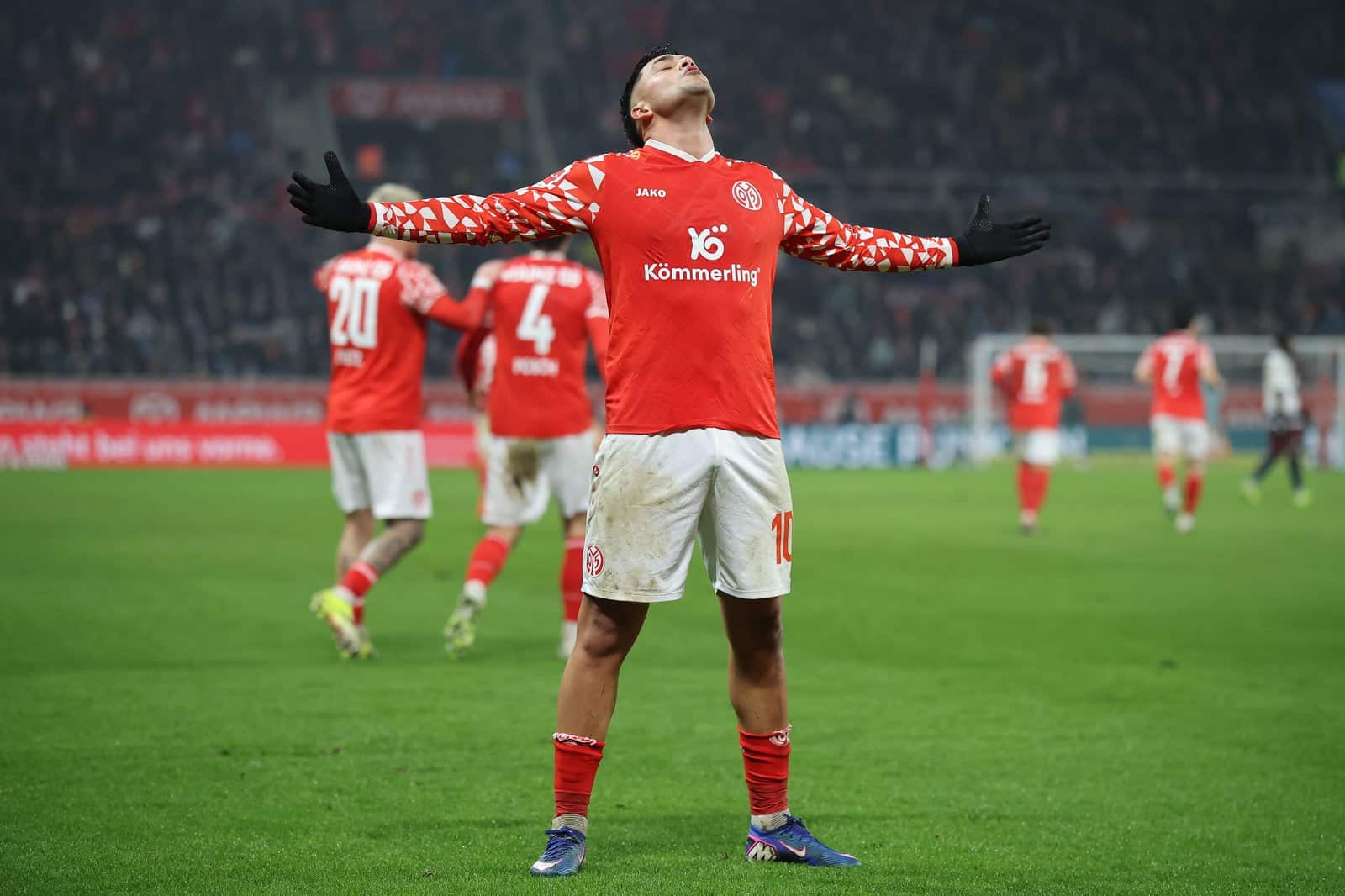 Nadiem Amiri von 1. FSV Mainz 05 jubelt mit ausgebreiteten Armen nach seinem Tor zur Führung im Bundesligaspiel gegen den Hamburger SV am 20. Februar 2026 in der MEWA Arena in Mainz. Alex Grimm / Getty Images