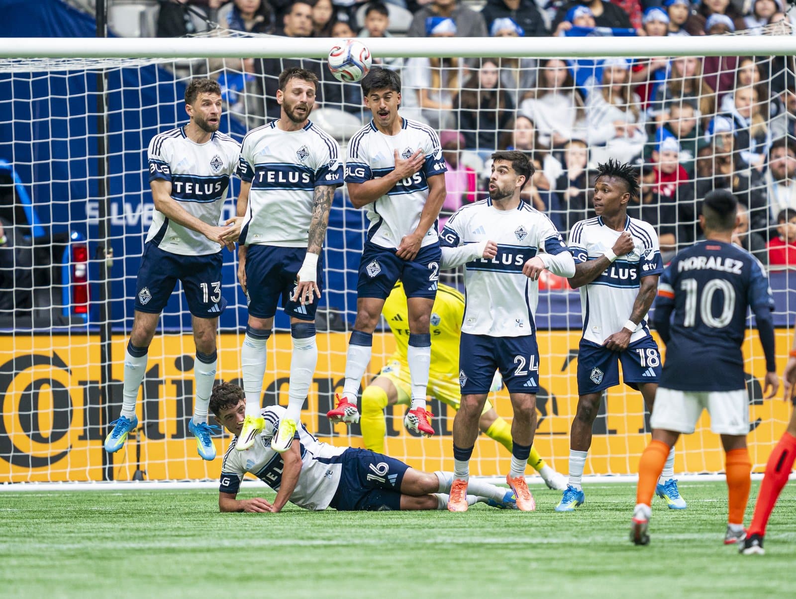 Thomas Müller von den Vancouver Whitecaps FC steht in der Mauer, als Maxi Moralez (#10) von New York City FC einen Freistoß über die Mauer – mit Tristan Blackmon, Mathias Laborda, Sebastian Berhalter, Brian White und Edier Ocampo – ans Tor bringt, aber knapp daneben zielt. Aufnahme aus der zweiten Halbzeit des MLS-Spiels im BC Place am 11. April 2026 in Vancouver, Kanada. Foto: Rich Lam / Getty Images