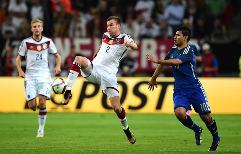 Argentiniens Stürmer Sergio Aguero (R) gegen Kevin Grosskreutz beim Freundschaftsspiel gegen Argentinien am 3.September 2014. AFP PHOTO / JOHN MACDOUGALL
