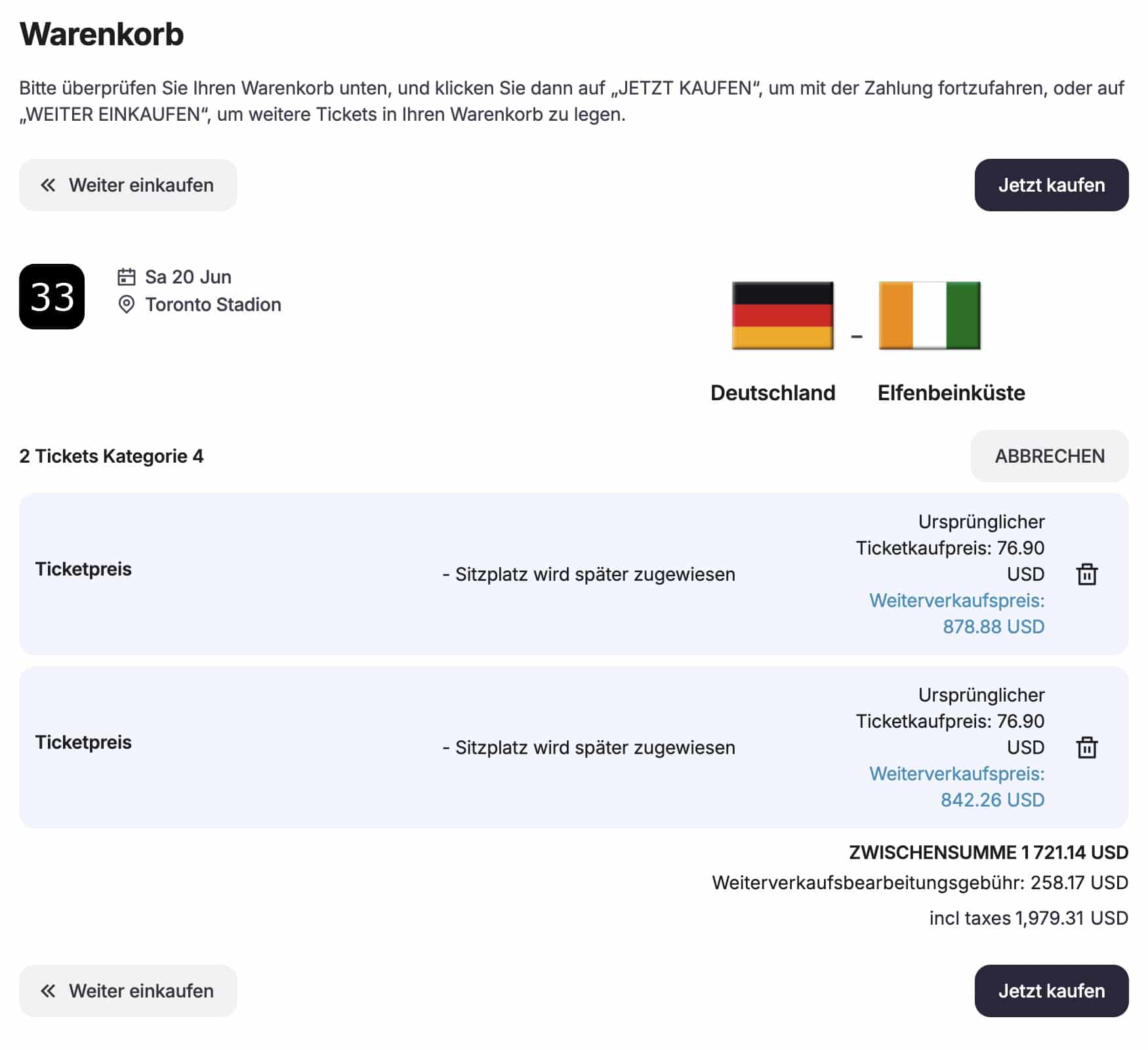 Auf der offiziellen Wiederverkaufsseite der FIFA notieren sich die Preise vieler Spiele deutlich über dem ursprünglichen Verkaufspreis. Beispiele zeigen die Dimension: Die billigste auf der Plattform verfügbare Final-Karte kostet noch immer 9.775 US-Dollar, während ein anderes Finalticket der Kategorie drei mit 143.750 US-Dollar inseriert ist. Für das Eröffnungsspiel Mexiko gegen Südafrika bietet die Plattform Tickets bis zu 5.234 US-Dollar an; in der Hauptverkaufsphase im Januar hatten diese Plätze noch 895 US-Dollar gekostet.