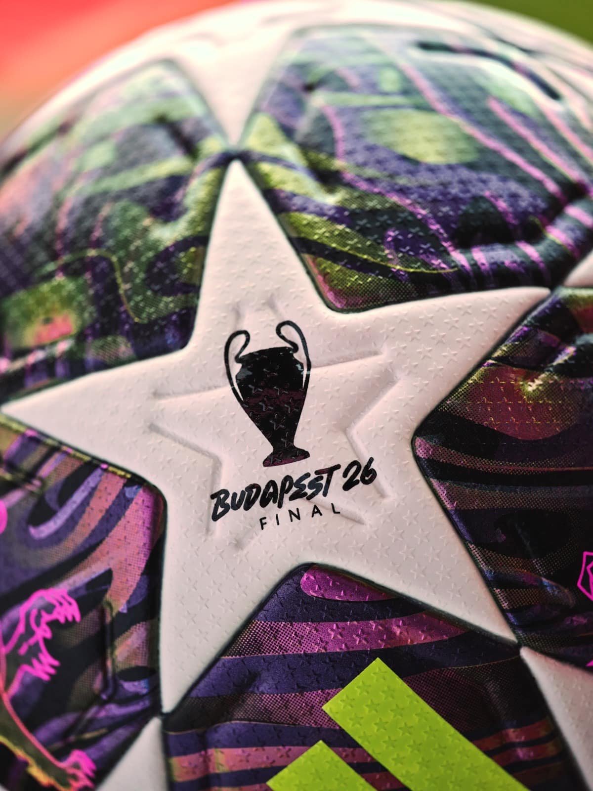 Im Zentrum des Finalballs steht eine metallisch violette Grundfarbe, die durch ein spezielles Pigment‑Finish je nach Licht und Blickwinkel unterschiedliche Nuancen zeigt. Das grafische Konzept orientiert sich an der charakteristischen Jugendstil‑Architektur Budapests: fließende Texturen und leuchtende Akzente verweisen auf Donau, Brücken und die nächtlich erleuchteten Straßen der ungarischen Hauptstadt. Als lokale Hommage zeigt das Design ikonische Löwen‑ und Drachenmotive, die Sinnbild für Stärke und städtische Stimmung sind. Für Sichtbarkeit auf dem Rasen sorgen die adidas‑ und UEFA Champions League‑Logos in kräftigem Gelb, die einen hohen Kontrast zur Grundfarbe setzen.